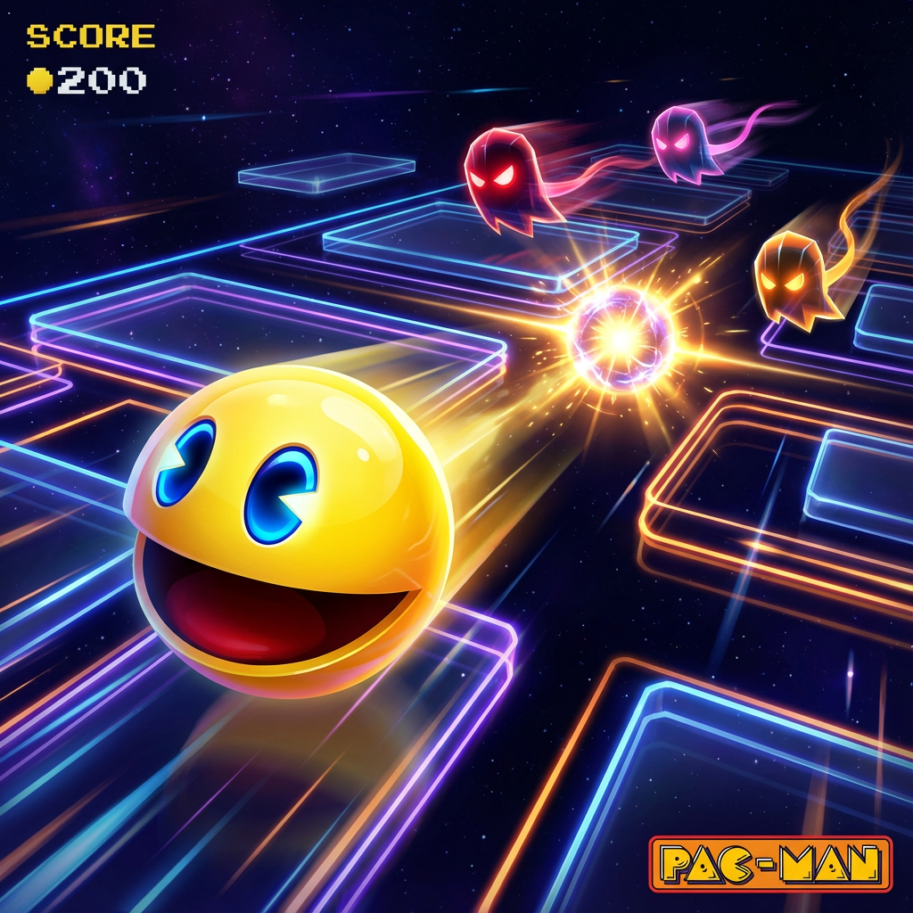 A bold, cinematic reinterpretation of Pac-Man in an ultra-stylish, high-energy setting. Pac-Man appears as a glossy, iconic spherical character with expressive eyes and a wide open mouth, racing through a futuristic neon-lit maze suspended in space. The maze glows with sharp geometric lines, floating platforms, and energy trails, creating a sense of speed and motion. Ghost enemies chase him dynamically, redesigned with sleek, modern shapes and glowing cores, each leaving luminous trails behind t